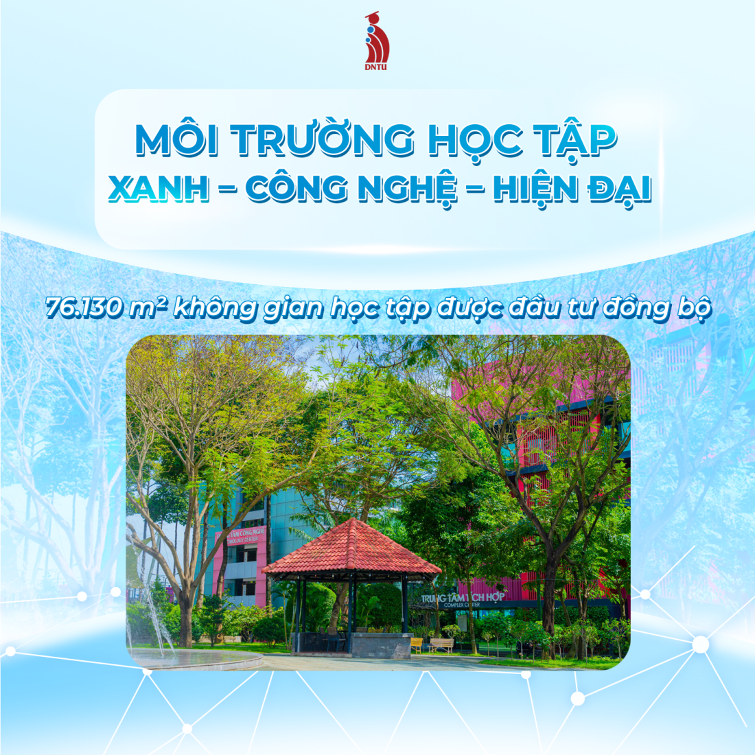 The university features a 76,130 m² campus with synchronized, modern, and eco-friendly infrastructure. This high-tech and "Green University" model not only serves academic purposes but also provides a sustainable foundation for students to develop in a healthy, creative environment.