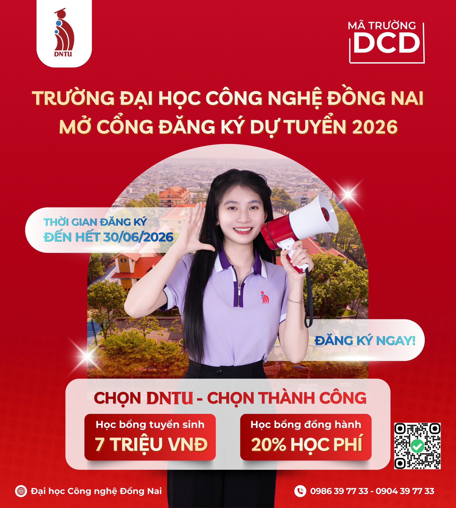 Trường Đại học Công nghệ Đồng Nai (DNTU) mở cổng đăng ký dự tuyển 2026 – nơi bạn được tư vấn ngành học phù hợp, xây dựng lộ trình học tập cá nhân và nắm chắc cơ hội trúng tuyển.