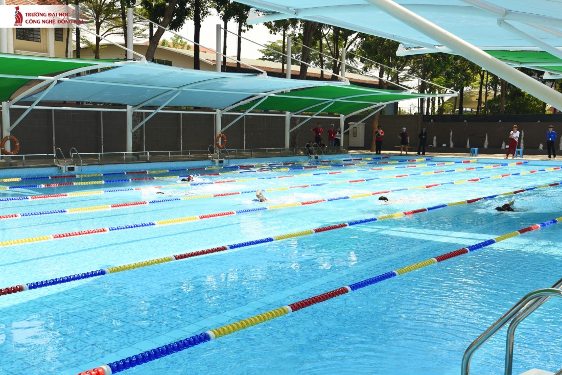 - Hồ bơi nước mặn hiện đại, đạt chuẩn quốc tế 2500m2, tới 8 làn bơi với hệ thống lọc và xử lý nước X-03 bằng công nghệ điện phân muối có khả năng đáp ứng việc dạy và học của 150 học viên.