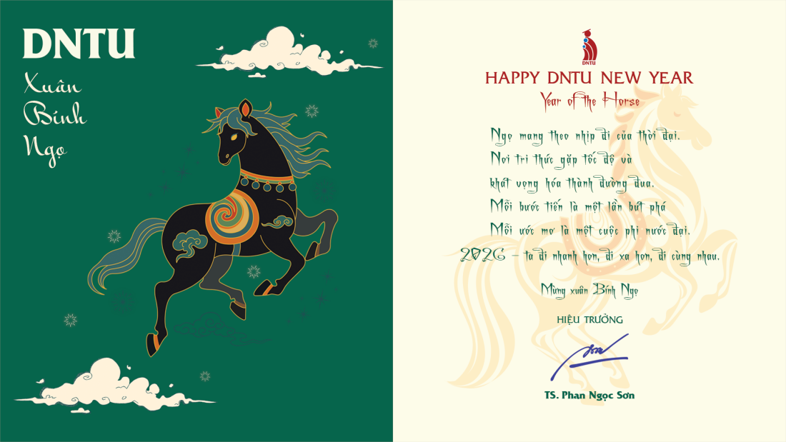 Khi những cánh mai đầu mùa khẽ chạm nắng xuân, khi nhịp sống chậm lại để nhường chỗ cho yêu thương và đoàn viên, mùa xuân Bính Ngọ nhẹ nhàng gõ cửa. Xuân mang theo hơi ấm của những khởi đầu mới, của niềm tin bền bỉ và những ước mong tốt đẹp đang được gieo mầm cho một hành trình phía trước. Nhân dịp đầu năm mới, Trường Đại học Công nghệ Đồng Nai kính chúc toàn thể đại gia đình DNTU một năm sức khỏe dồi dào, an khang, bình an. Kính chúc tập thể Nhà trường luôn vững vàng ý chí, bền bỉ trên hành trình tri thức, tiếp tục lan tỏa các giá trị nhân văn, nuôi dưỡng tinh thần đổi mới sáng tạo và phụng sự cộng đồng bằng trách nhiệm, tâm huyết và khát vọng phát triển bền vững.