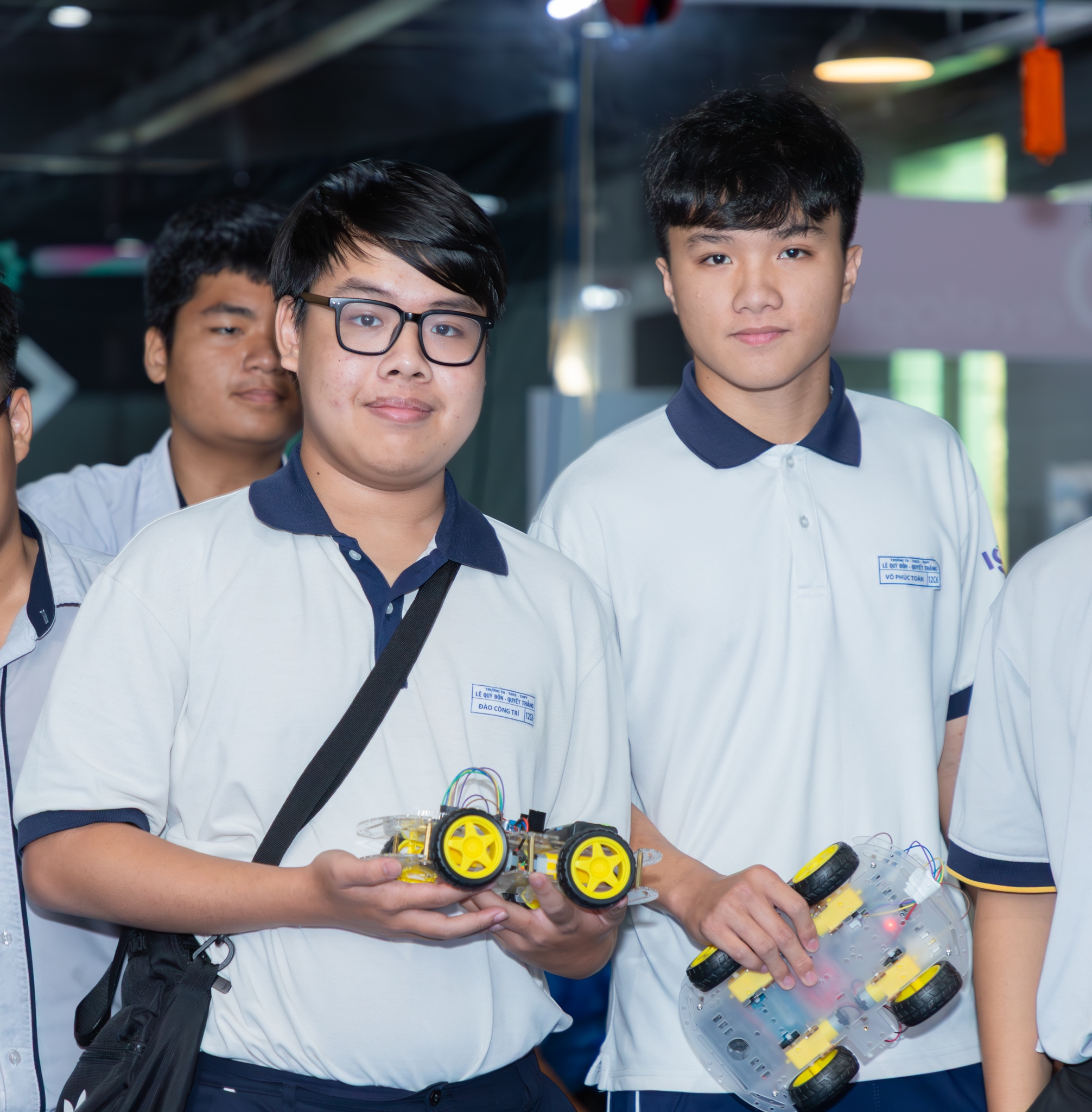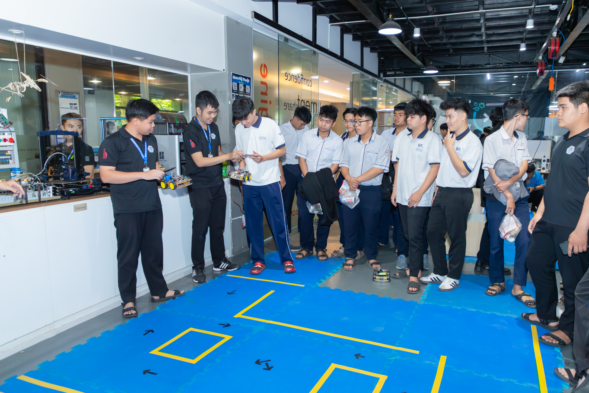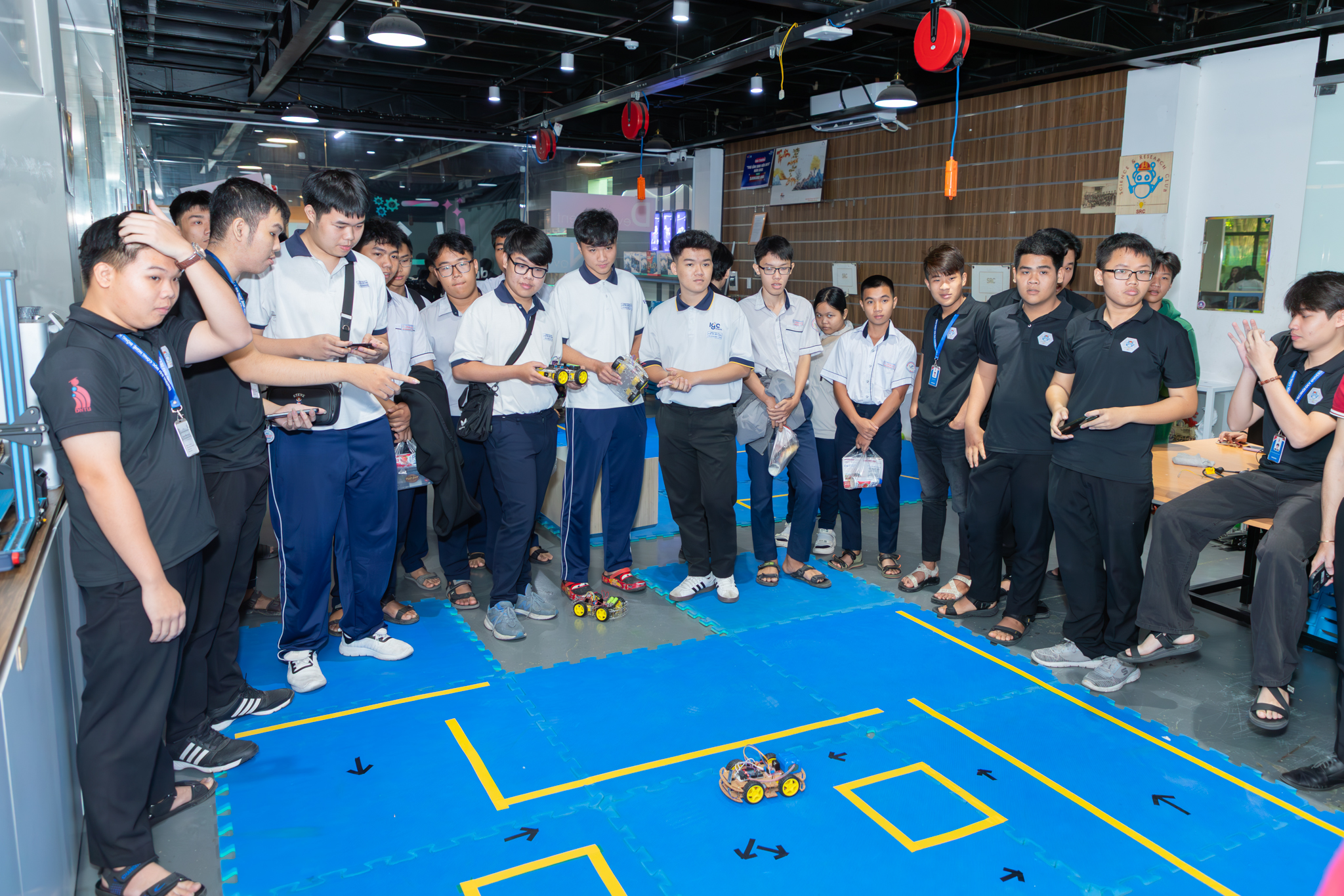 Khi những mô hình robot bắt đầu chuyển động, không khí xung quanh nhanh chóng trở nên sôi nổi. Các bạn học sinh không chỉ quan sát mà còn chủ động đặt câu hỏi, tìm hiểu về cách robot được thiết kế, cách hệ thống điều khiển hoạt động và quá trình để biến một ý tưởng thành một sản phẩm hoàn chỉnh.