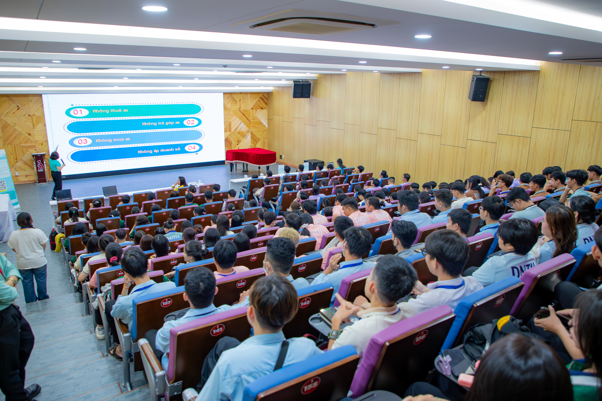 Bên cạnh phần chia sẻ, sinh viên DNTU còn được trải nghiệm thực tế các sản phẩm và dịch vụ xe điện của GSM, từ đó cảm nhận rõ lợi ích của việc di chuyển xanh – tiết kiệm – bền vững.
