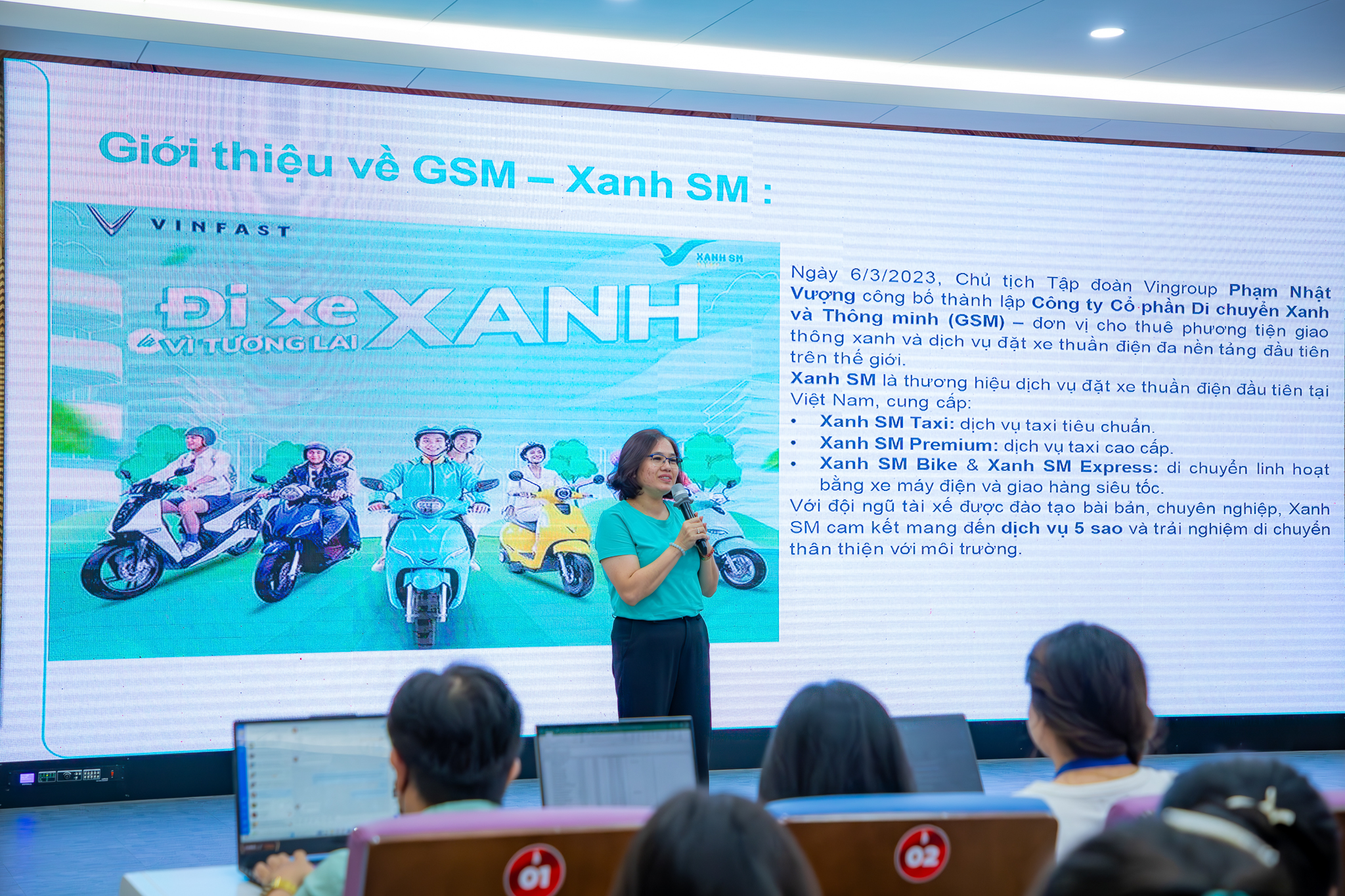 Tại buổi tọa đàm, bà Vũ Thị Phương - Trưởng phòng Phát triển Nguồn nhân lực GSM đã chia sẻ những thông tin hữu ích về mô hình vận hành xe điện, định hướng phát triển năng lượng xanh, cũng như các cơ hội hợp tác dành cho sinh viên DNTU. Qua đó, sinh viên được tiếp cận với những lựa chọn việc làm linh hoạt, phù hợp với quá trình học tập, giúp vừa tích lũy kinh nghiệm thực tế, vừa tạo thêm thu nhập.