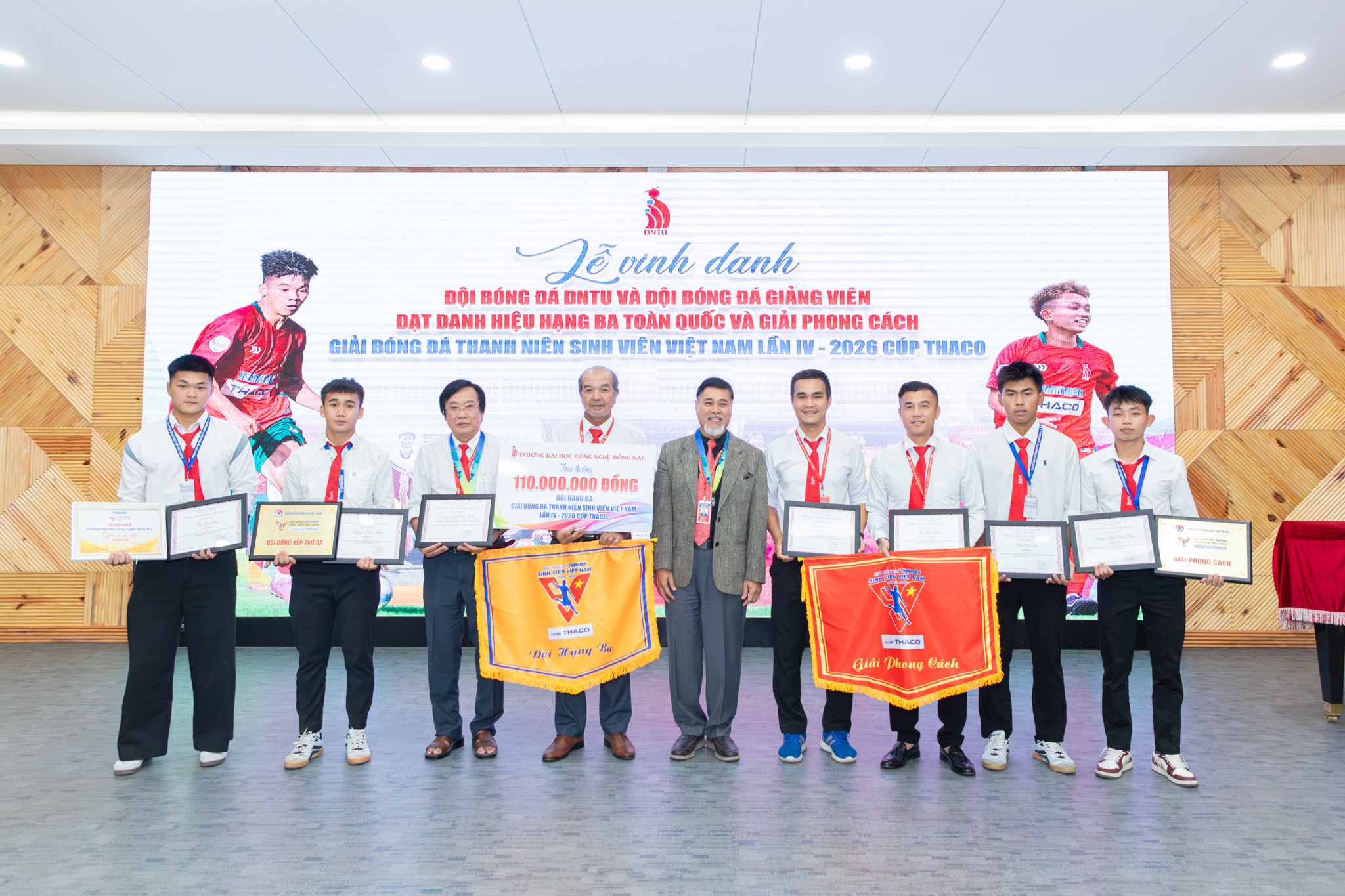 Nhằm ghi nhận và tôn vinh những nỗ lực đó, Trường Đại học Công nghệ Đồng Nai đã tổ chức vinh danh và trao thưởng 110.000.000 đồng cho tập thể DNTU FC. Phần thưởng không chỉ mang giá trị vật chất mà còn là sự ghi nhận xứng đáng cho hành trình thi đấu đầy tự hào, nơi từng thành viên đã cống hiến hết mình vì màu cờ sắc áo Nhà trường.