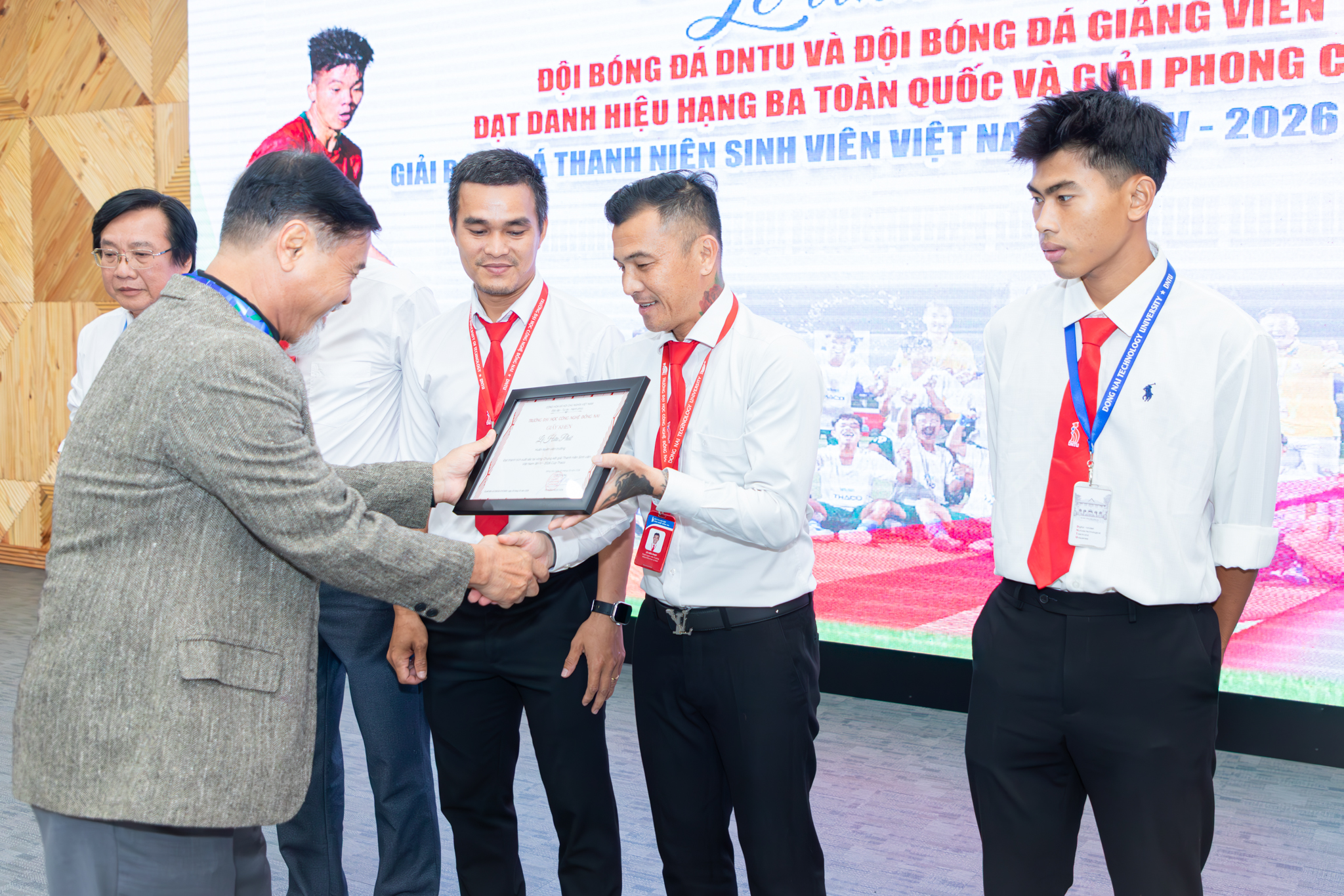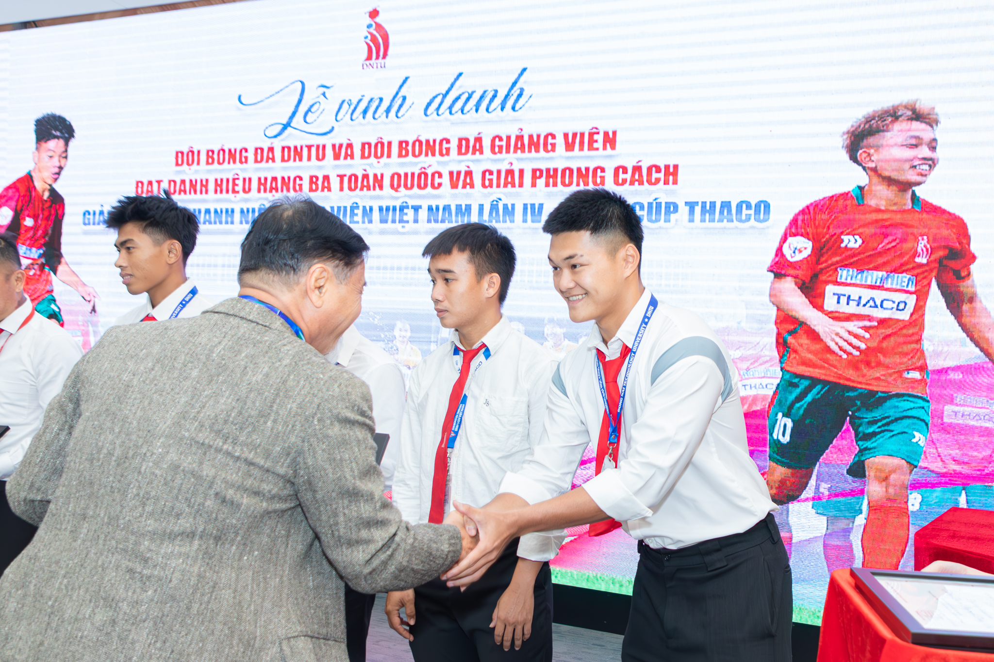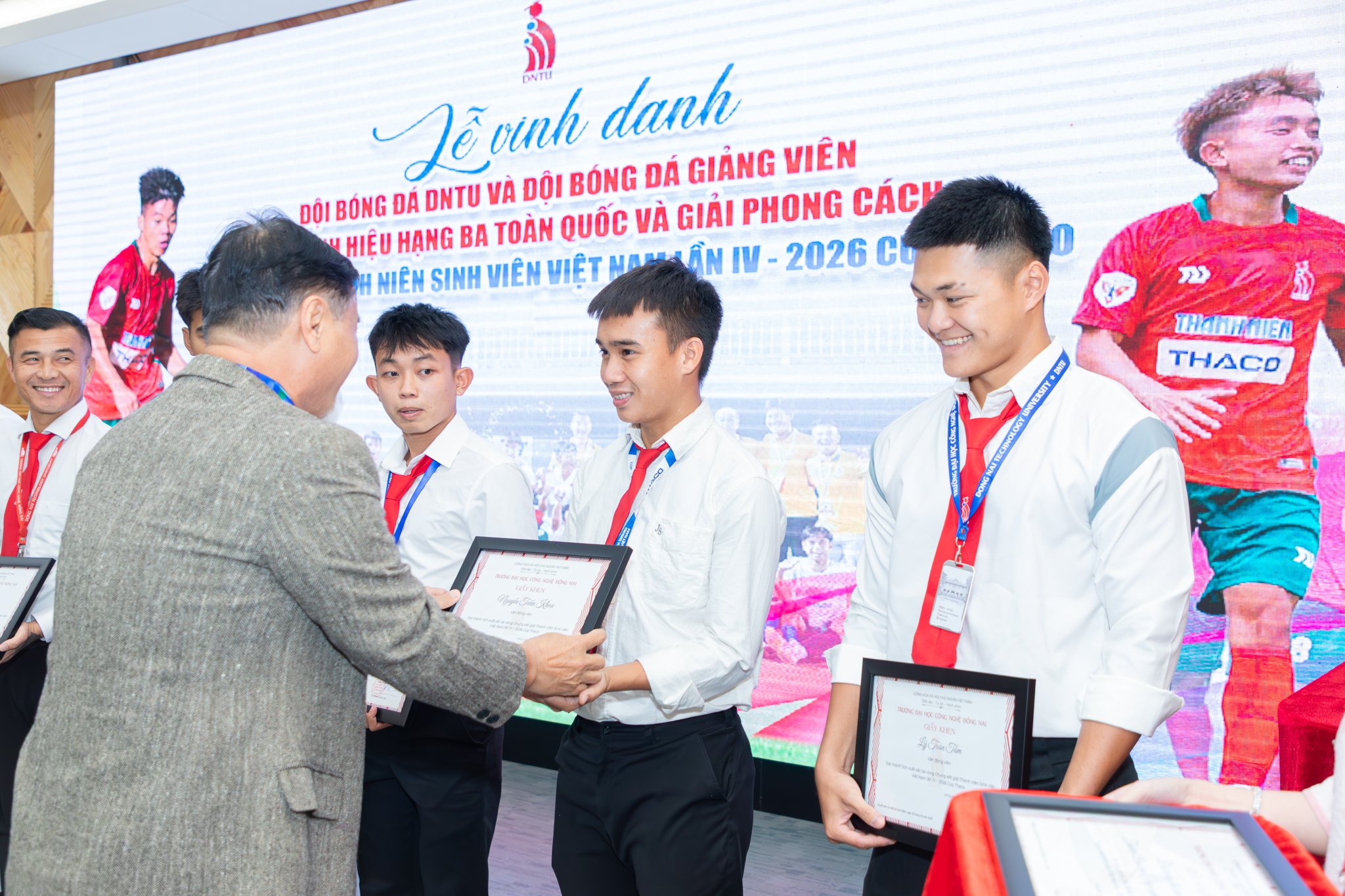 Sau hành trình thi đấu ấn tượng tại đấu trường bóng đá sinh viên toàn quốc, DNTU FC không chỉ mang về thành tích Hạng Ba mà còn lan tỏa tinh thần thi đấu đẹp, bản lĩnh và trí tuệ. Nhà trường đã tổ chức vinh danh, trao thưởng 110 triệu đồng nhằm ghi nhận xứng đáng những nỗ lực của toàn đội.
